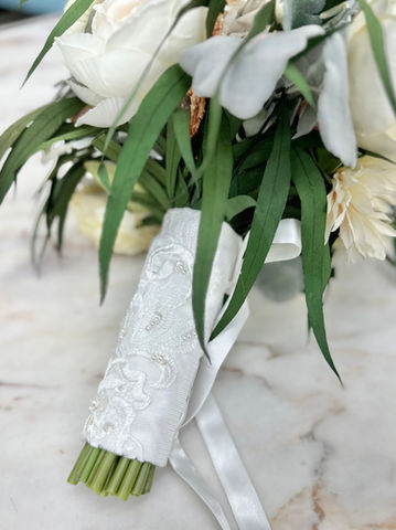Each one is made entirely from your mother’s wedding dress or from alteration scraps of your own. Our signature design includes thoughtful structure and custom lacing that keeps the wrap snug, smooth, and secure. No slipping, bunching, or wrinkling as you handle your bouquet throughout the day.