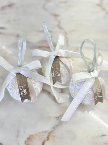 Each ornament includes a vegan leather tag with the last name and wedding year. You can also add a charm with a small wedding photo for an extra personal touch.